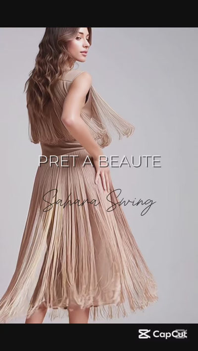 A dress that moves like desert sand in the wind. With dramatic fringe detailing, it hugs the body while creating breezy motion with every step. Its soft nude shade exudes understated luxury, while the structured bodice and stretch waist provide comfort and a flattering silhouette. A modern tribute to retro glam.