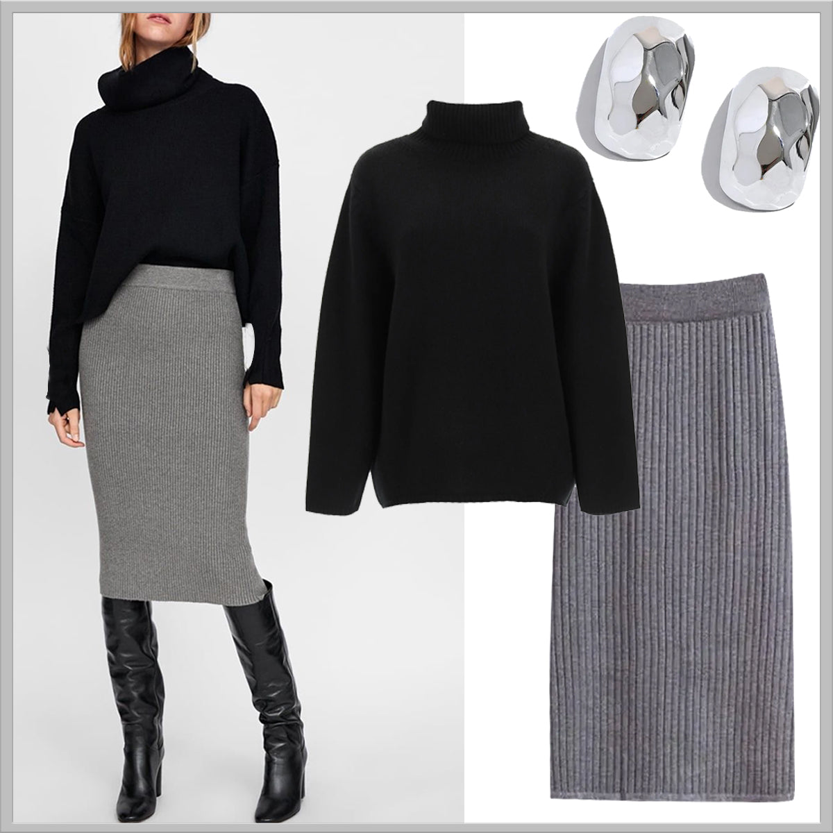 Ένα κλασικό σύνολο που σίγουρα θα καλύψει πολλές εμφανίσεις σας. Μία πλεκτή φούστα σε γκρι χρώμα μπορεί εύκολα να συνδυαστεί με ένα μαύρο τοπ, δημιουργώντας μια δυναμική εμφάνιση. Δεξιόστροφα από πάνω: πουλόβερ ΜONCYE, σκουλαρίκια ISABEL ROCHE, φούστα LAURA FERRI. Αποκτήστε όλο το σετ με έκπτωση 30%