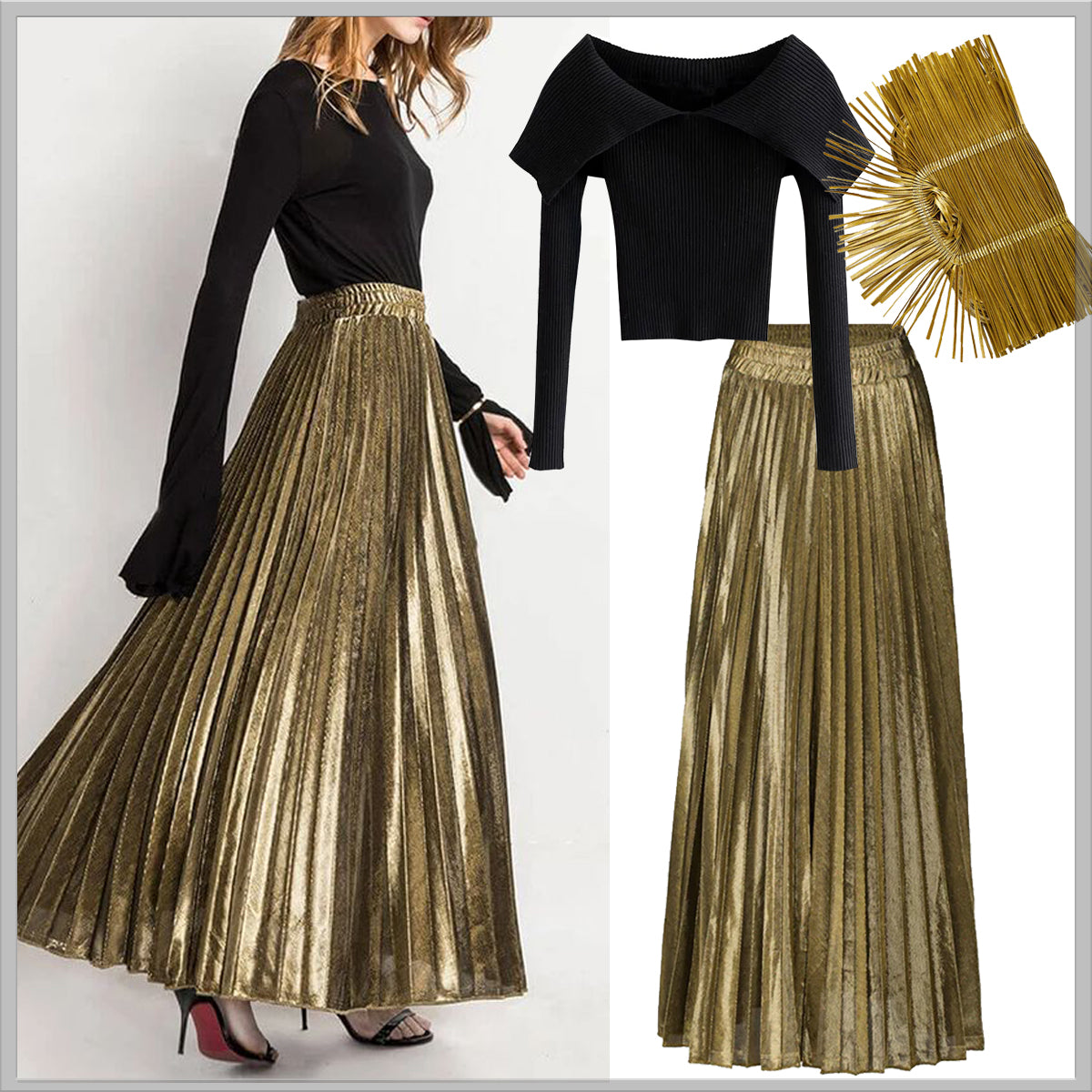 Γοητεύστε στην επόμενη εμφάνισή σας με τόνους χρυσού. Συνδυάστε μια χρυσή, μάξι φούστα με ένα μαύρο τοπ και φωτίστε το σύνολο με αξεσουάρ σε χρυσό. Ένα απλό αλλά εντυπωσιακό look που σίγουρα θα εντυπωσιάσει. Δεξιόστροφα από πάνω: τοπ LAURA FERRI, τσαντάκι ALEXANDRA TSOUKALA, φούστα LAURA FERRI. Αποκτήστε όλο το σετ με έκπτωση 30%