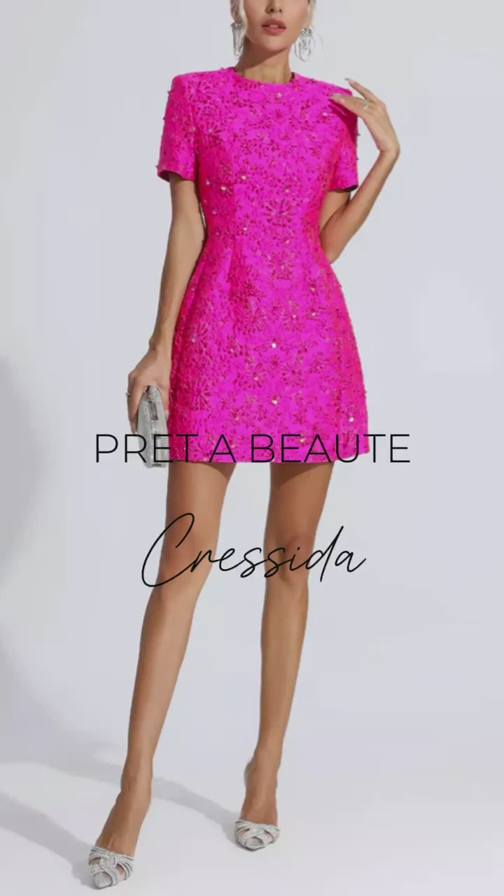 Mini-jurk van jacquard met borduursel. De Cressida jurk heeft een ronde halslijn en korte mouwen. Versierd met borduur- en bloemmotieven. Sluit met een ritssluiting. Raadpleeg onderstaande maattabel voor de juiste maatkeuze.