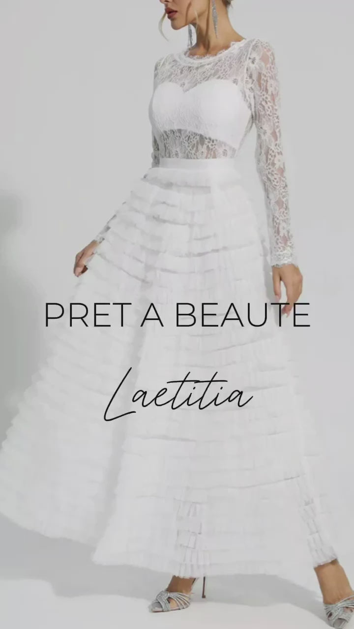De A-lijn Laeticia jurk is gemaakt van elastisch kant en heeft een transparante kanten top met een ronde halslijn en lange mouwen en een geplooide taartrok met tule en plooien. Combineer hem met hoge hakken en sprankelende sieraden voor een verbluffende look. Raadpleeg onderstaande maattabel voor het kiezen van de juiste maat.