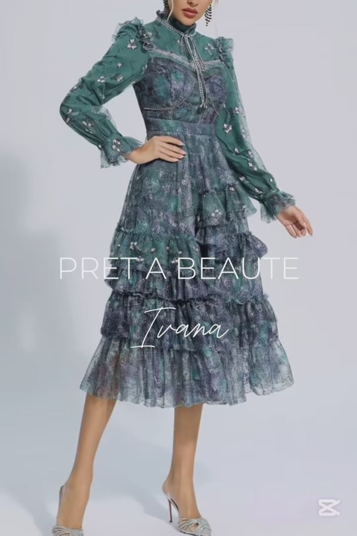 Romantische jurk met organza en ruches. De Ivana jurk is gemaakt van luchtig gebloemd organza, heeft een opstaande halslijn en lange mouwen. Het onderste gedeelte is versierd met franjes. Raadpleeg onderstaande maattabel voor de juiste maatkeuze.