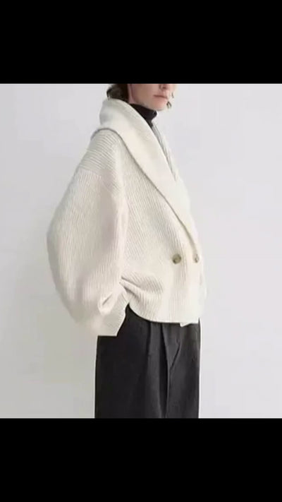 Het Nerisse vest valt op door zijn moderne, architectonische snit en zachte, gestructureerde breisel. De brede kraag valt elegant over de schouders, terwijl de kortere lengte zorgt voor een evenwichtige, eigentijdse look. Het model heeft een dubbele knoopsluiting, lange mouwen en een ontspannen pasvorm voor moeiteloze elegantie.